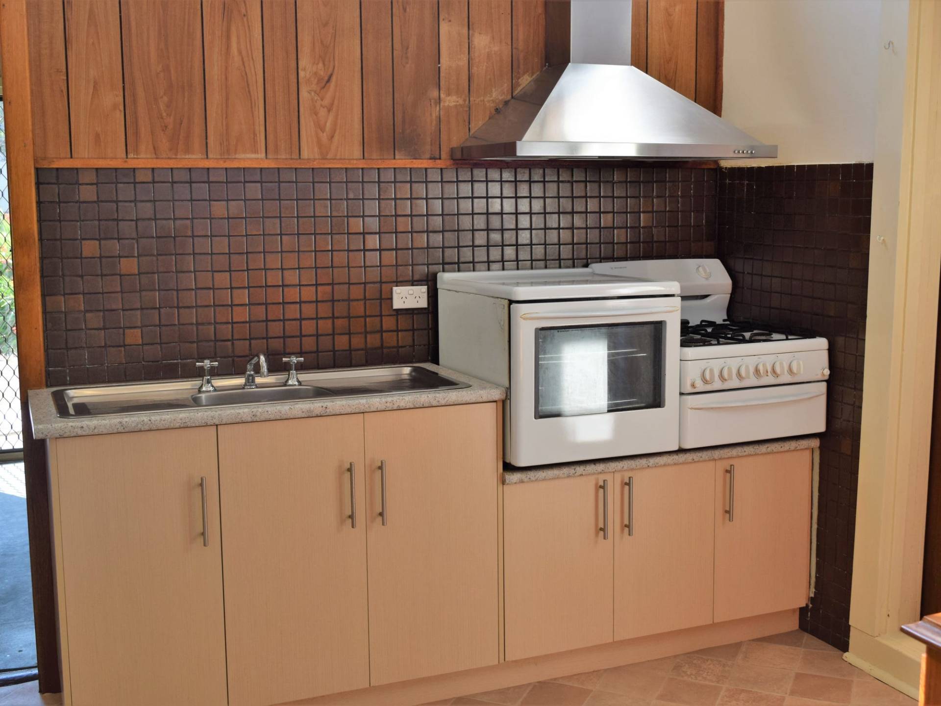 The easy to maintain compact kitchen features a gas cook-top, electric oven, a big walk-in-pantry, & a free standing buffet cabinet for extra storage space.